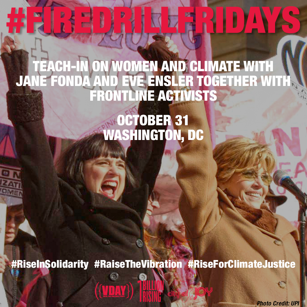 Actor, Activist & #VDay Board Member Jane Fonda is RISING! Fire Drill Friday Teach-Ins, actions and demonstrations every week. Don’t Miss Teach-In: Women – on Women and Climate with Jane and Eve Together with Frontline Activists