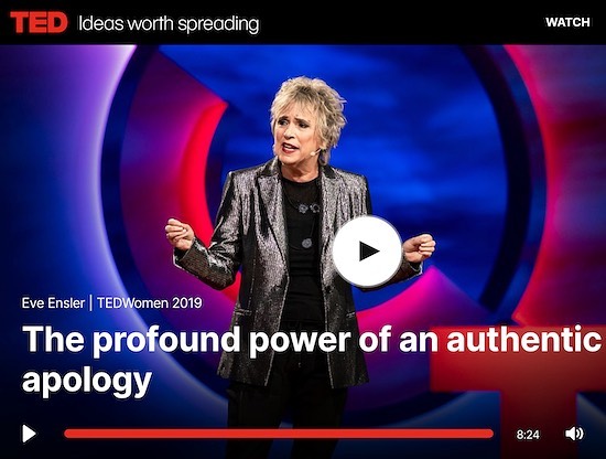 From TED: Genuine apology goes beyond remorse, says legendary playwright Eve Ensler. In this frank, wrenching talk, she shares how she transformed her own experience of abuse into wisdom on what wrongdoers can do and say to truly repent — and offers a four-step roadmap to help begin the process. (This talk contains mature content.)