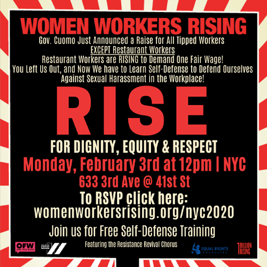 In response to Governor Cuomo’s New Year’s Eve announcement that he would enact One Fair Wage – a full minimum wage with tips on top – for all tipped workers except restaurant workers, women restaurant workers and their allies will stage a mass public self-defense training in front of the Governor’s office. Playwright/Founder of V-Day/One Billion Rising Eve Ensler, One Billion Rising, actress Carmen LoBue, social justice artist/musician Taína Asili, and the Resistance Revival Chorus will be joining One Fair Wage members and allies in demanding One Fair Wage and safe and dignified workplaces for all.