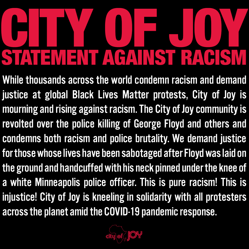 While thousands across the world condemn racism and demand justice at global Black Lives Matter protests, City of Joy is mourning and rising against racism. The City of Joy community is revolted over the police killing of George Floyd and others and condemns both racism and police brutality. We demand justice for those whose lives have been sabotaged after Floyd was laid on the ground and handcuffed with his neck pinned under the knee of a white Minneapolis police officer. This is pure racism! This is injustice! City of Joy is kneeling in solidarity with all protesters across the planet amid the COVID-19 pandemic response.