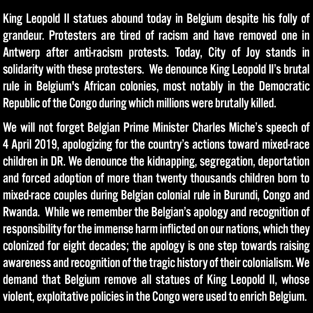 King Leopold II statues abound today in Belgium despite his folly of grandeur. protesters are tired of racism and have removed one in Antwerp after anti-racism protests. Today, City of Joy stands in solidarity with these protesters. We denounce King Leopold II’s brutal rule in Belgium’s African colonies, most notably in the Democratic Republic of the Congo during which millions were brutally killed.