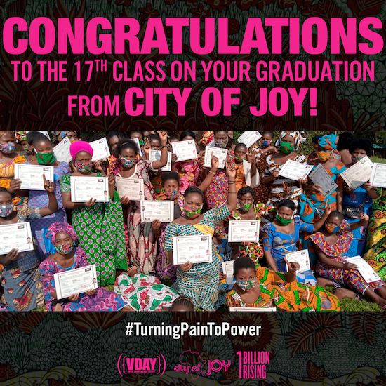 “We are proud of these leaders, who recovered their true potential. We are proud to have journeyed with a dedicated team to reach the expected results of the training and healing of 89 women despite the trying circumstances that the pandemic brought. We are thankful and really grateful to V (formerly Eve Ensler) and to V-Day, who trusted us and accepted our decision to continue our program while most of the NGOs in our area closed their doors and expats left the country. We are thankful to our donors and supporters. Let’s keep Raising the Vibration!” – Christine Schuler Deschryver, Co-Founder & Director City of Joy, Director V-Day Congo