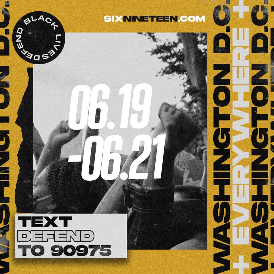 Together let’s join the Movement for Black Lives (M4BL)’s SIXNINETEEN mobilization on Juneteenth weekend, 19-21 June. Take action from home, in your community, or in Washington, D.C. Visit sixnineteen.com for information on how you can be involved in this historic weekend of actions.