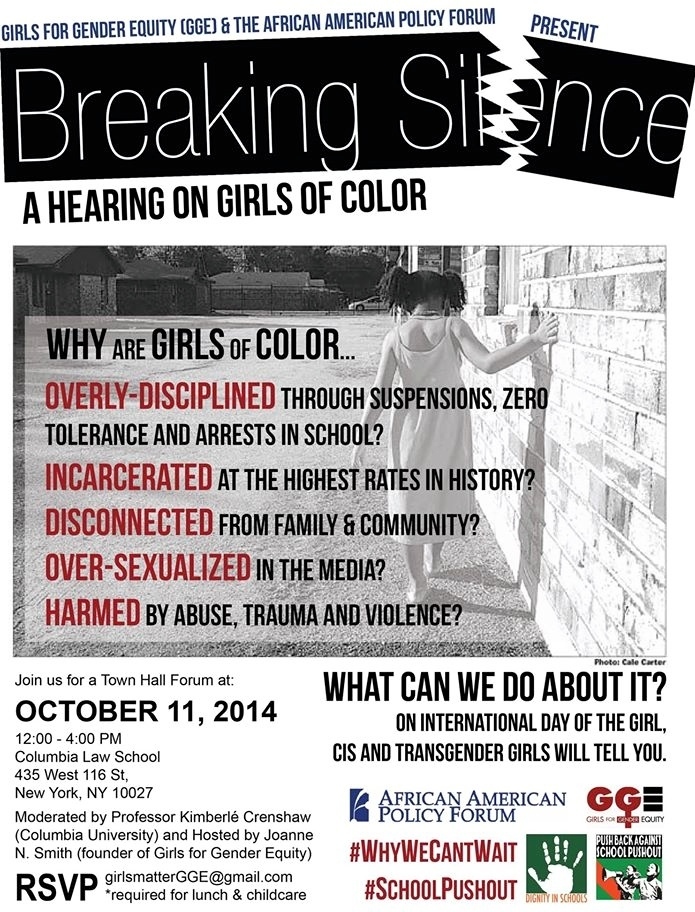 Breaking Silence – A Hearing on Girls of Color is part of the African American Policy Forum’s two-day event In Plain Sight: Towards Engendering The Fight For Racial Justice In The 21st Century which will focus on elevating the experiences of women of color in order to build an inclusive and comprehensive racial justice movement.