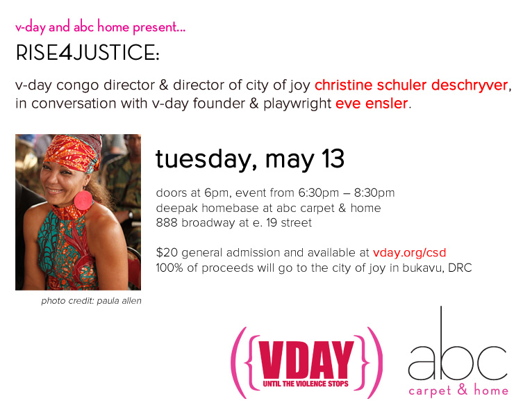 On Tuesday, 13 May, join V-Day Congo Director/Director of City of Joy Christine Schuler Deschryver and Eve Ensler for a special RISE4JUSTICE event and reception at ABC Carpet & Home in NYC.