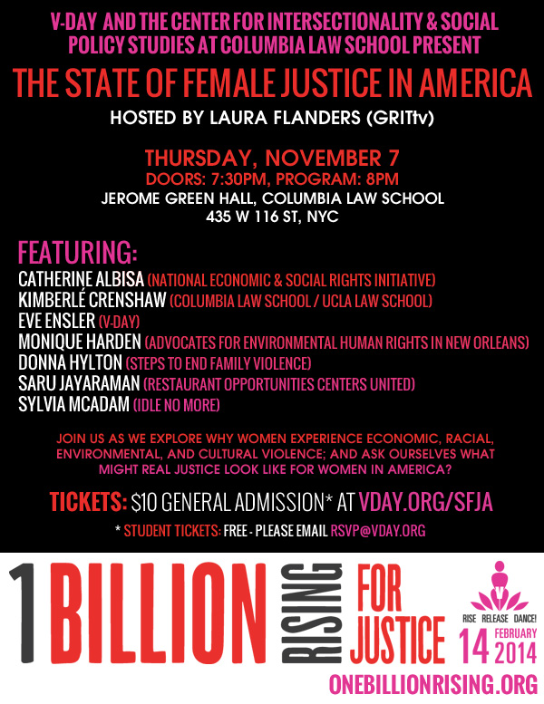 Building on last year’s sold-out public forum on the State of Female America, V-Day is bringing together a stellar group of women for a public panel discussion on The State of Female Justice.