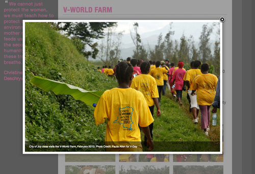 Join us as drc.vday.org where you will meet the people of City of Joy; hear voices from Bukavu and beyond; visit the V-World Farm through incredible images by Paula Allen; explore the history of City of Joy and V-Day’s work in Congo; learn the 10 guiding principals, and more.