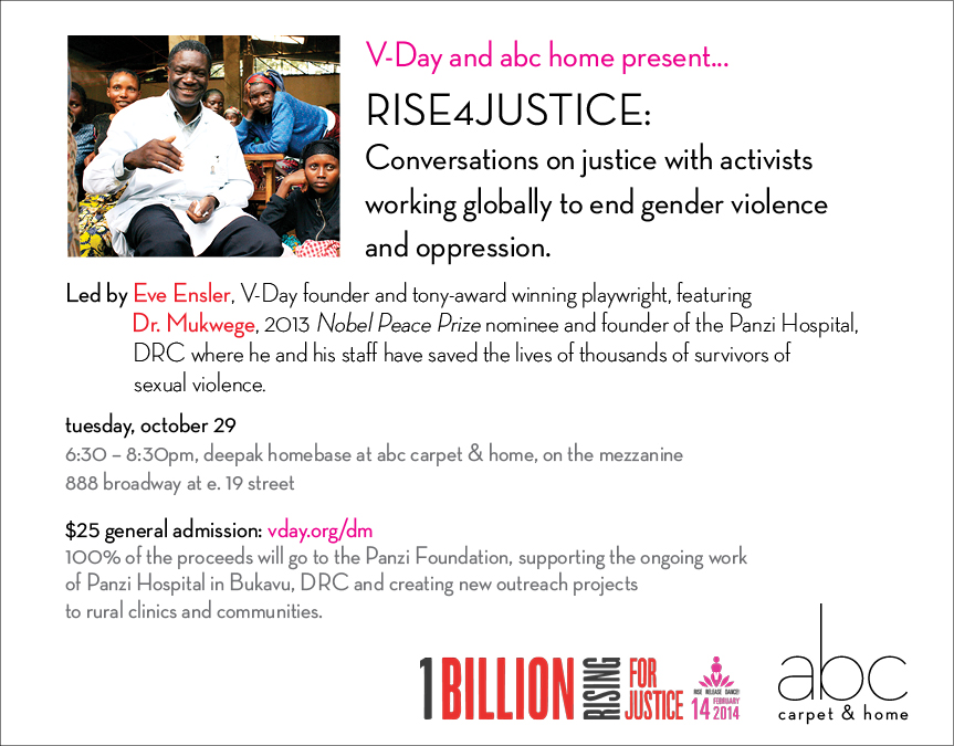 An Evening with Dr. Denis Mukwege & Eve Ensler is part of the RISE4JUSTICE Speakers Series which will examine the meaning of justice to activists working globally to end gender violence and oppression, while looking at impunity caused by the intersection of poverty, racism, war, the plunder of the environment, capitalism, imperialism, and patriarchy. The series is presented by V-Day, the global activist movement to end violence against women and girls, and ABC Carpet & Home.