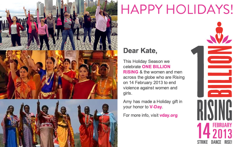 As 2012 draws to a close and we reflect on another successful year at V-Day, we are deeply grateful to you, our activists, supporters, colleagues, and RISERS! Your generosity and continued commitment to ending violence against women and girls humbles and excites us.