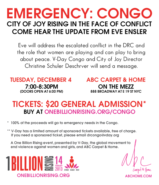 ** V-Day has a limited amount of sponsored tickets available, free of charge. If you need a sponsored ticket, please email drcongo@vday.org