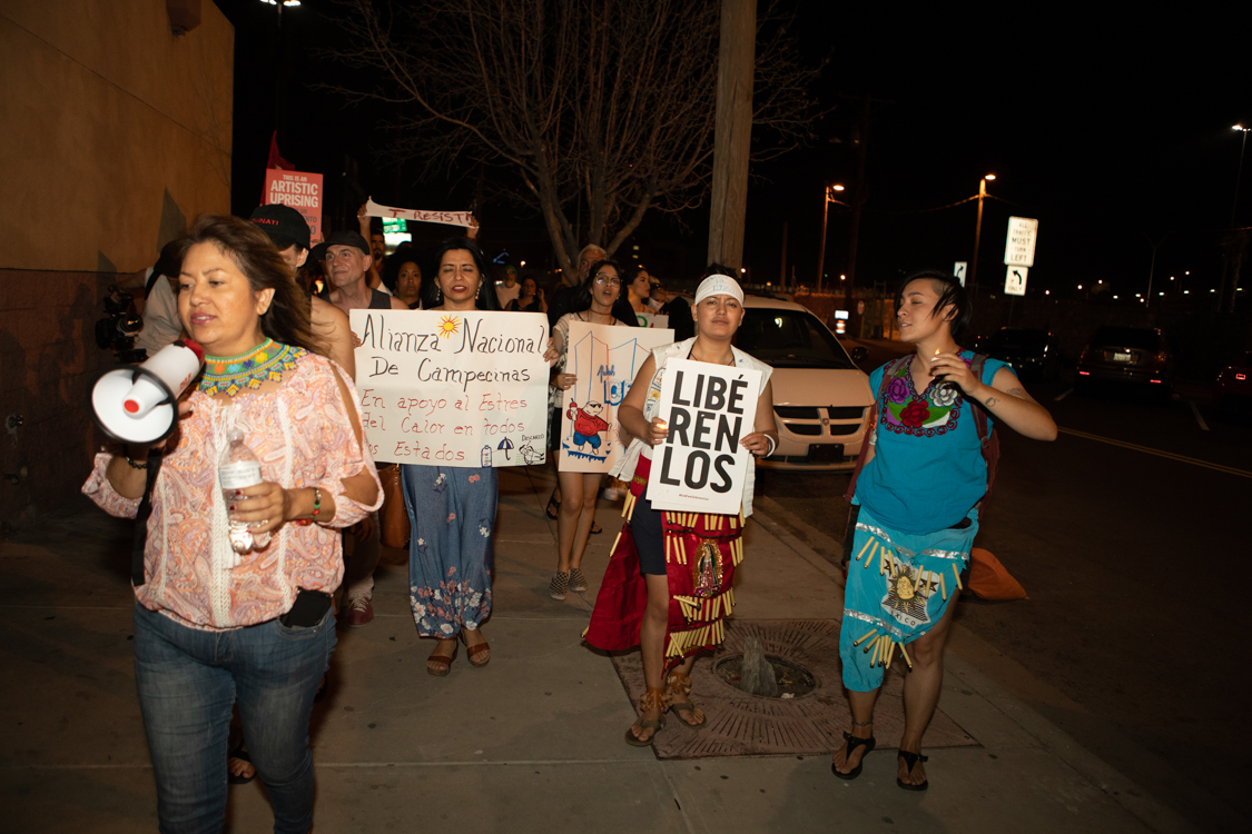 When organizer Lorena Andrade took the stage to kick off the event, she gestured to the processing center. “This is where our people are held,” she said. “This is where this whole, horrible process begins. And we are here to be loud with our poems, with our songs, with our danza, with our drums. With everything that is in us, we are going to demand of these people that they let our people go.”