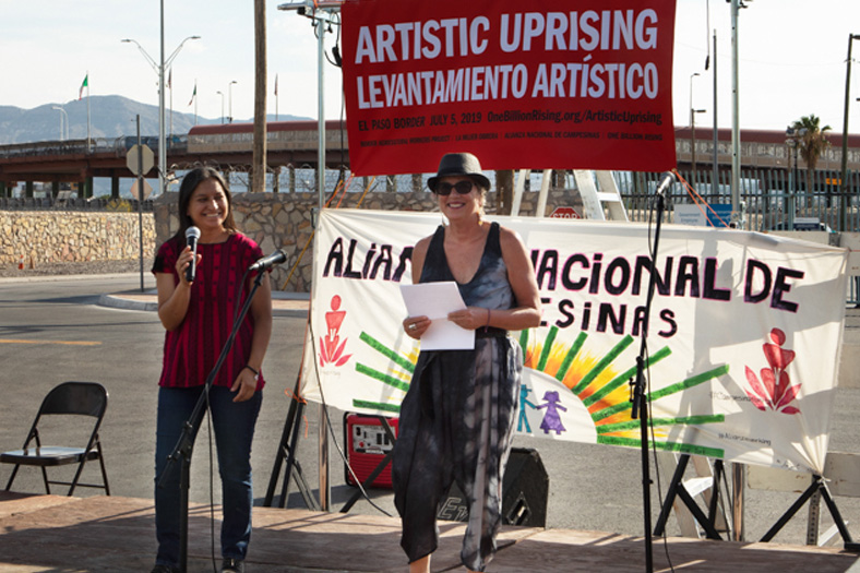 “Last night we brought in the revolutionary winds in El Paso Texas through our singing, dancing, poetry, readings, testimonies, performance art, fire dancing and drumming. Over 30 artists arrived from all over the country and locally to the Border Agricultural Workers Project which generously hosted our Artistic Uprising. We rose up honoring and celebrating migrants to join forces and denounce the diabolical inhumanity being enacted at our borders and in detention centers. So proud of the extraordinary solidarity between La Mujer Obrera and Allianza Nacional De Campesinas and One Billion Rising which energized and created this event. This all happened in 8 days. Just imagine what’s coming! Artists have the power to tear down walls, push boundaries and dissolve borders. Thank you thank you thank you to everyone who turned out.” – Eve Ensler