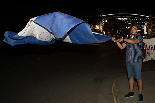 At the end of the night, a group of artists and activists marched to the base of the Paso del Norte International Bridge. As Customs and Border Protection officers looked on from a distance, the marchers chanted phrases like “never again is now” and “no U.S. violence in our name, immigrants are not to blame.”