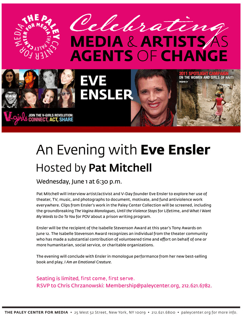 Join V-Day Board member and CEO of the Paley Center Pat Mitchell for an evening with Eve at the Paley Center for Media in NYC on June 1st.