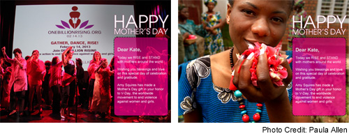 Celebrate Mother’s Day by supporting the global movement to end violence against women and girls. NEW this year, V-Day is offering two Mother’s Day V-Card designs to chose from. Make a donation to V-Day on behalf of your mother, friends, and loved ones, and V-Day will send the specially designed 2012 Mother’s Day V-Card of your choice letting them know of their unique gift in their honor.
