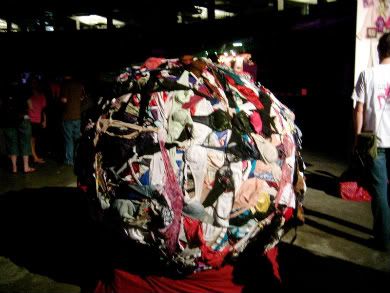 We followed a line of women (and a few scattered men) into the Superdome early Friday morning. After being thoroughly searched and promising never to turn on our video camera, we were allowed admittance. The entrance was decorated with a selection of feminist art pieces such as poster board sized pages of a graphic novel entitled, “Oh fuck, I’m a Victim.” In it, artist Vicki Rabinowicz depicts a woman who is followed, kidnapped, and raped. In one frame, she is drawn small enough to fit in her attacker’s hand as he masturbates onto her entire body then flushes her down the toilet. At the end of the strip we discover that the victim is the artist and that she drew this on her 28th birthday, tens years after the attack. Not all of the pieces were as jarring though. To the left lay a ball of bras (think office ball of rubber bands) roughly five feet tall. The only thing holding this work together seemed to be the very godforsaken wired hooks of each boulder holder. Along the back wall was a timeline of shirts, bags, posters, and other promo items representing performances from around the world. Near that was an altar with lit candles to honor those who fell to final rest when Katrina hit.