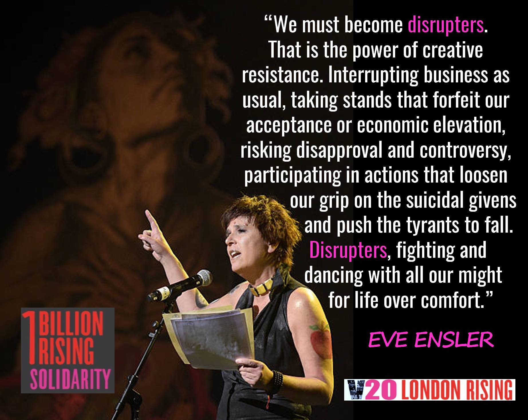 The time is now, to keep building, fostering, nurturing, and inspiring real, powerful solidarity amongst all movements. And to keep creating art as forms of rebellion, disruption, celebration and hope. Art that calls on us all to Rise for love and life. Please join us! Tickets are £36.00 and can be purchased here: www.onebillionrising.org/londonrising