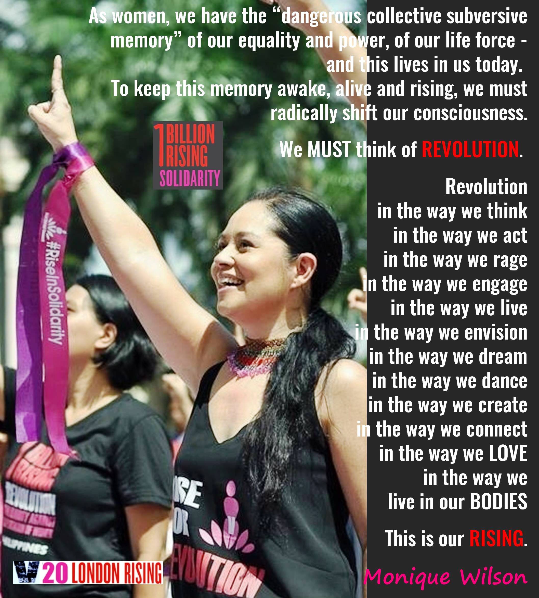 As we come into our 7th year of One Billion Rising, we are faced with bigger challenges. To end violence against women, we must commit ourselves to a deeper examination of violence in all its forms. Along with sexual and physical violence, we must also look at systemic violence in economic, political, socio-cultural, environmental and ideological spheres. As we continue to Rise to end violence against women – it is imperative now for us to expand our understanding of women’s oppression and exploitation in the context of capitalism, colonization, racism, imperialism, environmental plunder and war. We have been compartmentalized and divided for too long. Our Rising must now connect our specific oppression to the common universal humanity that binds us all. This is no less than a way of life, a way of seeing, a way of being in the world. It is not one day that we rise, but every day that this consciousness must rise in all we do.