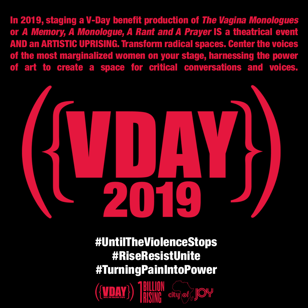 This year, in place of a traditional V-Day Spotlight monologue, we invite activists to amplify and lift up the often unheard and excluded voices of survivors, activists and groups in your communities by creating three community-written testimonies, to be performed at the end of the play. These pieces should center the voices of the most marginalized women on your stage, harnessing the power of The Vagina Monologues to create a space for critical conversations and voices. READ more about Testimonies of Rising.